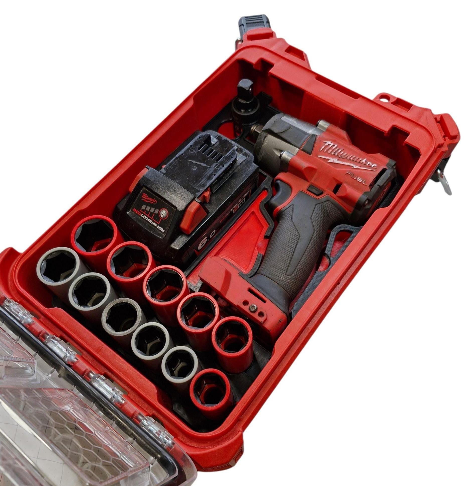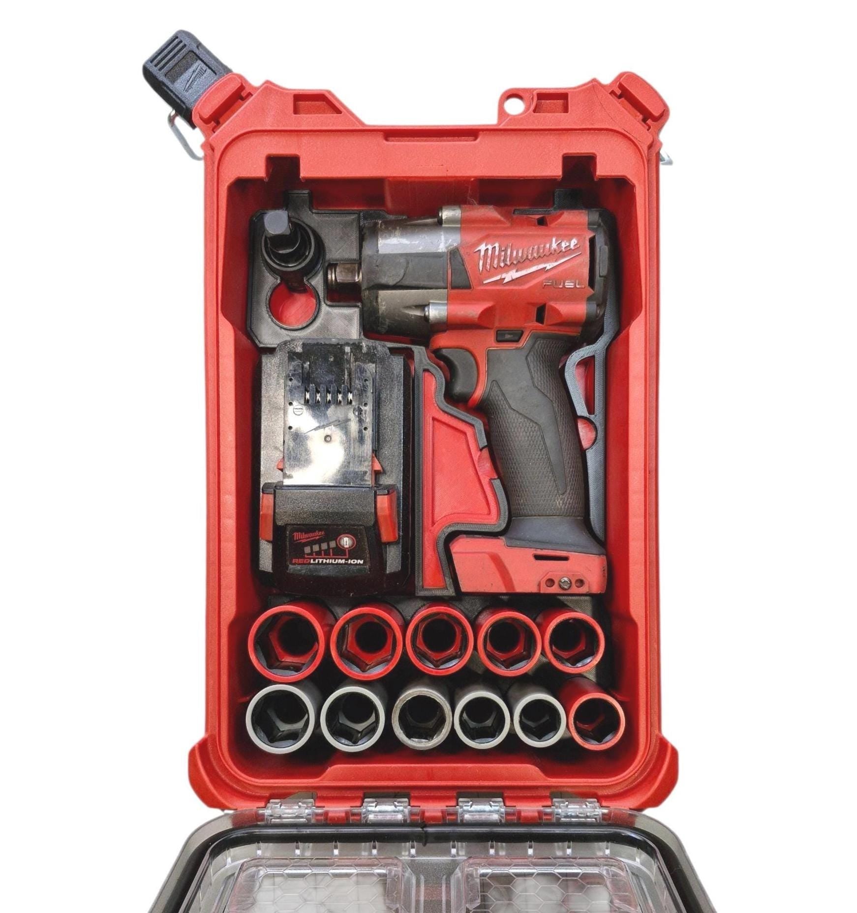 This 3D-printed insert is designed for the Milwaukee M18 FUEL Mid-Torque Impact wrench (2962-20) and fits perfectly inside the Milwaukee PACKOUT system (48-22-8435).